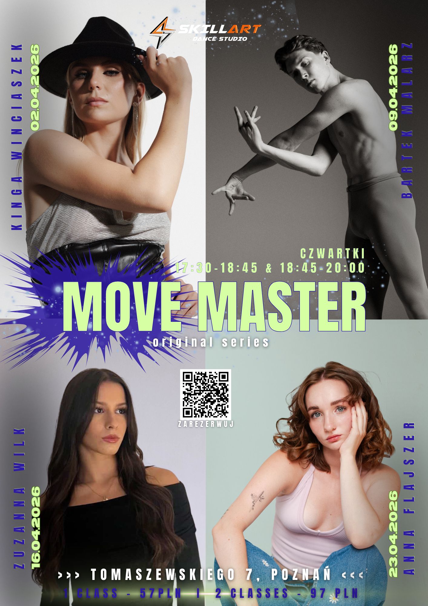 Move Master to cotygodniowe lekcje w formie open (niezależnie od wieku czy poziomu), na które co tydzień przyjeżdża inny szkoleniowiec z Polski. Warto uzupełnić swój rozwój o takie lekcje, ponieważ zapewniają one dynamiczny progres.